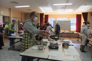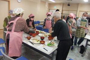 今回は13名男性が参加し、包丁持参するなど料理の腕前を披露してくれました。貧血に注意しましょうという献立で秋野菜もつかった役立つレシピです。ホームページにレシピを載せていますので、ご参考いただきご活用ください。【献立】